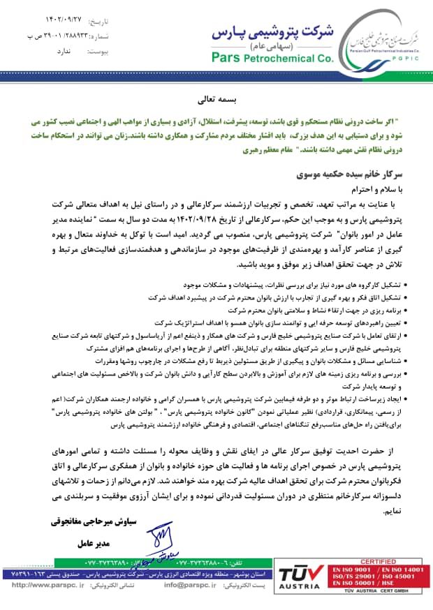 به گزارش پژواک بوشهر؛ مدیرعامل پتروشیمی پارس با صدور حکمی، سیده حکیمه موسوی را به عنوان نماینده خود در امور بانوان منصوب کرد.